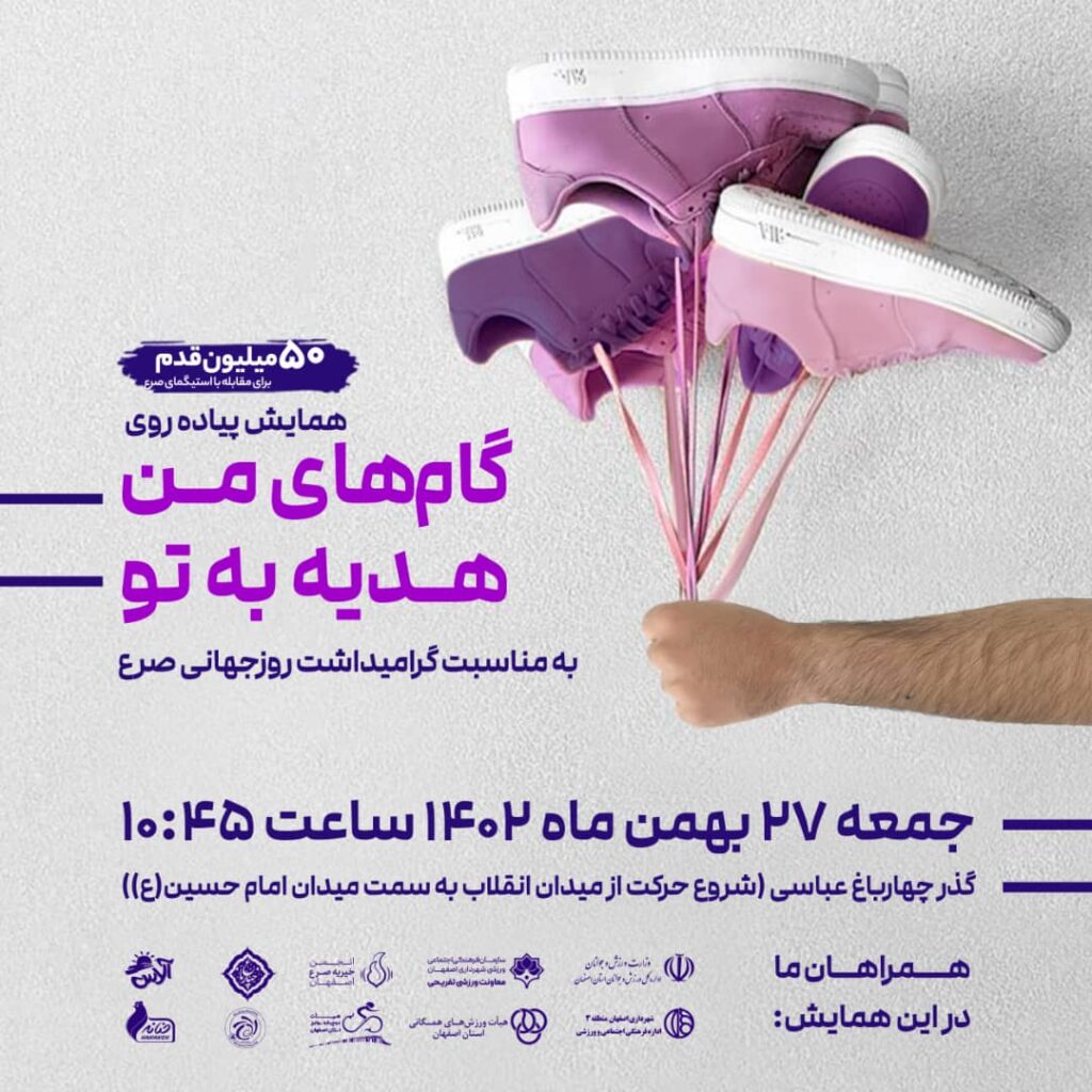 به مناسبت روز جهانی صرع همراه با پویش پنجاه میلیون گام به حمایت از افراد مبتلاء به صرع در کل دنیا، برای سومین سال متوالی جمعه، 27 بهمن ماه 1402 ساعت 10:45 در گذرگاه چهارباغ عباسی همراه با هیأت های ورزشی با همدیگر برای مبارزه با استیگما و تبعیض های اجتماعی و حمایت از عزیزان مبتلاء به صرع گام های مان را هدیه می دهیم. شروع حرکت: میدان انقلاب و پایان مسیر : میدان امام حسین به امید روزهای پر از آگاهی… ما با تفاوت هایمان دنیا را قشنگ تر می کنیم.